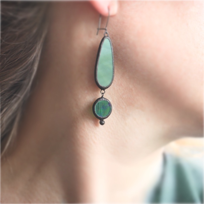 These Tiffany glass earrings are an elegant fusion of handcrafted artistry, color harmony, and timeless design. Created using the classical Tiffany copper-foil technique, each element is carefully cut, foiled, soldered, patinated, and polished by hand. The elongated emerald element offers a soft, diffused glow, while the lower round glass piece reflects a subtle opalescent shimmer. Together, they form a pair of earrings that feels both modern and deeply artistic.